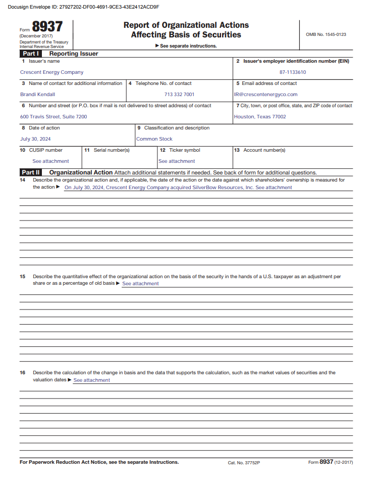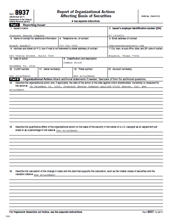 Todd Falk has served as Crescent Energy Company’s Chief Accounting Officer since December 2021, prior to which he served as Vice President, Finance of Crescent’s predecessor entity. Mr. Falk joined KKR in 2018 and is a Managing Director and Chief Accounting Officer of KKR’s Energy Real Assets business. Prior to joining KKR, Mr. Falk served as Director of Finance and Controller of Vitruvian Exploration. Mr. Falk began his career at Deloitte, where as a senior manager he assisted clients with complex financial reporting issues, specializing in initial public offerings and other interactions with the SEC. Mr. Falk has over 18 years of finance and accounting experience in the energy industry, is a Certified Public Accountant and holds a B.S., magna cum laude, in Accounting and an M.S. in Finance from Texas A&M University.